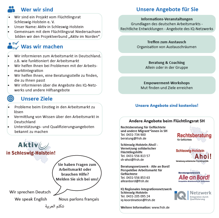 Das Projekt „Aktiv in Schleswig-Holstein“ richtet sich an migrantische Communities in Schleswig-Holstein und informiert durch aufsuchende Beratung und Schulungen über den deutschen Arbeitsmarkt sowie über Möglichkeiten der Arbeitsmarktintegration. Ziel ist es, Orientierung zu geben, Zugänge zu erleichtern und Menschen auf ihrem Weg in den Arbeitsmarkt zu stärken. In den kommenden drei Jahren bietet das Projekt mehrsprachige Informationsveranstaltungen, Beratung und Coaching vor Ort an. das Team des Projektes liefert fachgerechte Informationen direkt dort, wo sie gebraucht werden, und leiten bei Bedarf zu relevanten Stellen (z. B. zur Anerkennung von Berufsabschlüssen) weiter.